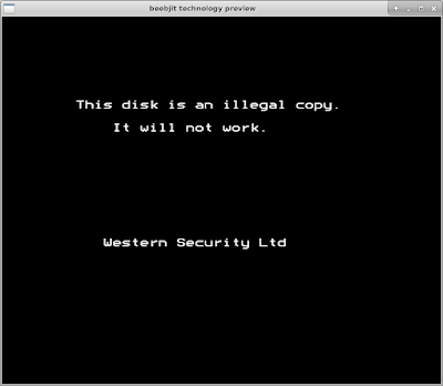 There remains the mystery of how a commercial duplicator could handle making these discs. One thing I've come across is references to a "Freeform" script [link], used in conjunction with Trace duplicators. I haven't been able to find a manual for this scripting language. There are some strange fragments in the memory of the loader after de-obfuscation; could it be related? 3F80: 54 70 00 41 44 44 20 20 20 20 20 72 00 4D 4F 56 Tp.ADD r.MOV 3F90: 45 54 4F 20 20 74 00 55 4E 49 54 20 20 20 20 75 ETO t.UNIT u 3FA0: 00 54 52 41 43 4B 20 20 20 76 00 53 45 43 54 4F .TRACK v.SECTO 3FB0: 52 20 20 77 00 54 4F 50 54 52 41 43 4B 78 00 55 R w.TOPTRACKx.U Recreating Western Security style protected discsI happen to have a couple of very different disc drives, so I thought I'd try them out. I formatted a disc in each drive, then had a look at the track lengths (in bytes) read back by a WD1772 disc controller in a real BBC Micro model B.  Track 1 sectors 10 length 3137 fixups 1 CRC32 67F0950E Track 2 sectors 10 length 3138 fixups 1 CRC32 67F0950E Track 3 sectors 10 length 3138 fixups 1 CRC32 67F0950E Track 4 sectors 10 length 3139 fixups 1 CRC32 67F0950E Track 5 sectors 10 length 3138 fixups 1 CRC32 67F0950E Track 6 sectors 10 length 3140 fixups 1 CRC32 67F0950E Track 7 sectors 10 length 3140 fixups 1 CRC32 67F0950E Track 8 sectors 10 length 3139 fixups 1 CRC32 67F0950E Track 9 sectors 10 length 3140 fixups 1 CRC32 67F0950E Track 10 sectors 10 length 3140 fixups 1 CRC32 67F0950E [...]Track lengths from Mitsubishi MF504C: [...] Track 1 sectors 10 length 3119 fixups 1 CRC32 67F0950E Track 2 sectors 10 length 3119 fixups 1 CRC32 67F0950E Track 3 sectors 10 length 3118 fixups 0 CRC32 67F0950E Track 4 sectors 10 length 3119 fixups 1 CRC32 67F0950E Track 5 sectors 10 length 3119 fixups 1 CRC32 67F0950E Track 6 sectors 10 length 3119 fixups 1 CRC32 67F0950E Track 7 sectors 10 length 3119 fixups 1 CRC32 67F0950E Track 8 sectors 10 length 3119 fixups 1 CRC32 67F0950E Track 9 sectors 10 length 3118 fixups 1 CRC32 67F0950E Track 10 sectors 10 length 3119 fixups 1 CRC32 67F0950E [...] These two drives definitely have unique fingerprints! The older drive has a bit more variance / wobble in individual track lengths. In fact, it seems to fit more bytes per track on the later sectors -- most of the latter tracks are length 3142. The older drive also generally fits 20 or so more bytes per track. This means it is spinning a little slower. By contrast, the newer drive runs like clockwork with minimal track-to-track variance. This might make it a little less suitable for generating varied per-disc fingerprints, but copying the disc on home computing hardware would still be tricky -- the machine used would need to have a similarly precise drive, and the drive would also need to be running at the exact same speed as the drive that made the original disc. One last look at track lengths, this time from a Phantom Combat game disc, by Doctor Soft. This disc uses Western Security Ltd. protection: Track 1 sectors 10 length 3152 fixups 0 CRC32 67F0950E Track 2 sectors 10 length 3152 fixups 1 CRC32 67F0950E Track 3 sectors 10 length 3152 fixups 0 CRC32 67F0950E Track 4 sectors 10 length 3152 fixups 1 CRC32 67F0950E Track 5 sectors 10 length 3151 fixups 0 CRC32 67F0950E Track 6 sectors 10 length 3152 fixups 0 CRC32 67F0950E Track 7 sectors 10 length 3150 fixups 0 CRC32 67F0950E Track 8 sectors 10 length 3151 fixups 0 CRC32 67F0950E [...]This is disc protection hidden in plain sight. These 8 protected tracks are in fact 100% default format tracks (CRC32 67F0950E). There's the correct number of sectors and there are no deleted sectors. discbeast would show these tracks as plain green, aka. move on, nothing to see here! There's a bit of track length wobble from track to track, but the tracks are also unusually long (the ideal is 3125 bytes). It is not clear whether the tracks were deliberately laid down a little long, but it definitely helps the disc protection. Any disc drive used to attempt to re-create these tracks is unlikely to be spinning at that speed because it is 0.8% slow and the disc drive motor technology is generally better than that. It's interesting to note that simple long track protection is just another variant in the Western Security scheme. This disc was probably written from a BBC Micro itself, rather than a fancy duplication machine, as evidenced by the lack of a duplicator marker and by the fact the game data sectors show evidence of being written sector-at-a-time, not track-at-a-time. Who knows, maybe there was a deliberate attempt to find a slow drive; some older drives even have a twiddleable variable resistor to vary motor speed.