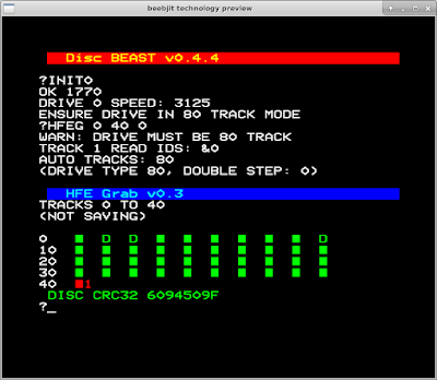 My captured disc 3F71: 4A 4D 4B 4A 4B 4D 4D 4A Expectations 3D9B: 4A 4C 4B 4A 4B 4D 4C 4A As can be seen, my disc reads almost exactly to expectations except track 2, which was 3125 bytes instead of the expected 3124. That's within the +-1 range so all 8 tracks pass the check (7 or more are required). To spell it out, the protected loader expects the track length (in FM encoded bytes) for tracks 1-8 inclusive to be 3122, 3124, 3123, 3122, 3123, 3124, 3123, 3122. That's an incredible level of precision and accuracy of writing for 1985 technology. Each byte covers about 64us on a spinning disc, but disc drives of the era would often specify running RPM variation of "less than +-1.5%". At 300rpm, +-1.5% is +-3ms per rotation! In my experience, drives are much much better than that but still! How did 1985 technology cope?? One further note, on the WD1770 vs. Intel 8271 disc controllers. We've focused our analysis on the protection as seen by the WD1770. This disc also loads fine with an Intel 8271 controller. It uses a completely different code path to indirectly calculate track length in this case. It works because the padding bytes up to the end of the track are all 0x00 instead of the usual 0xFF. An "over-read" past the final sector on the track is used, and track length is detected by the change from reading 0x00 to 0xFF. The genius twistAnd then we realize the genius of this scheme. What if they didn't write the tracks with extreme precision, because the technology wasn't there? What if they just wrote the track any-old-how and then examined the result? I think this what they did: - Format the disc. (That's it. Just format the disc normally and you've created a fiendishly protected disc.)