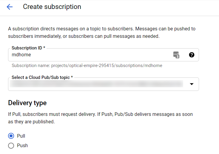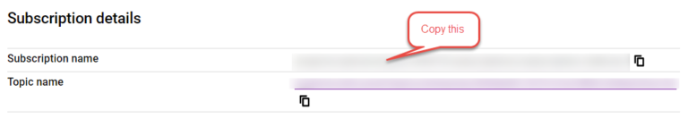 - From the Google Cloud Platform console we are going to create a Pub/Sub subscription. Here is a direct link.