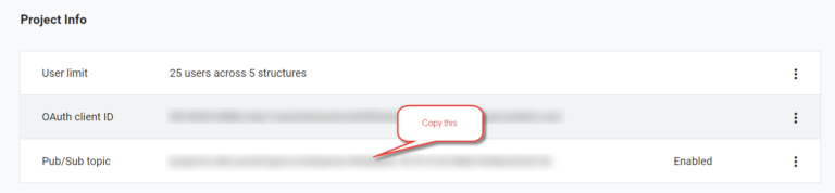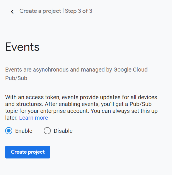 These are three of the four configuration parameters that are required for the new Nest Integration. Next up we need to create a Pub/Sub subscriber to follow the SDM API Event. Follow the steps for this in the next paragraph.