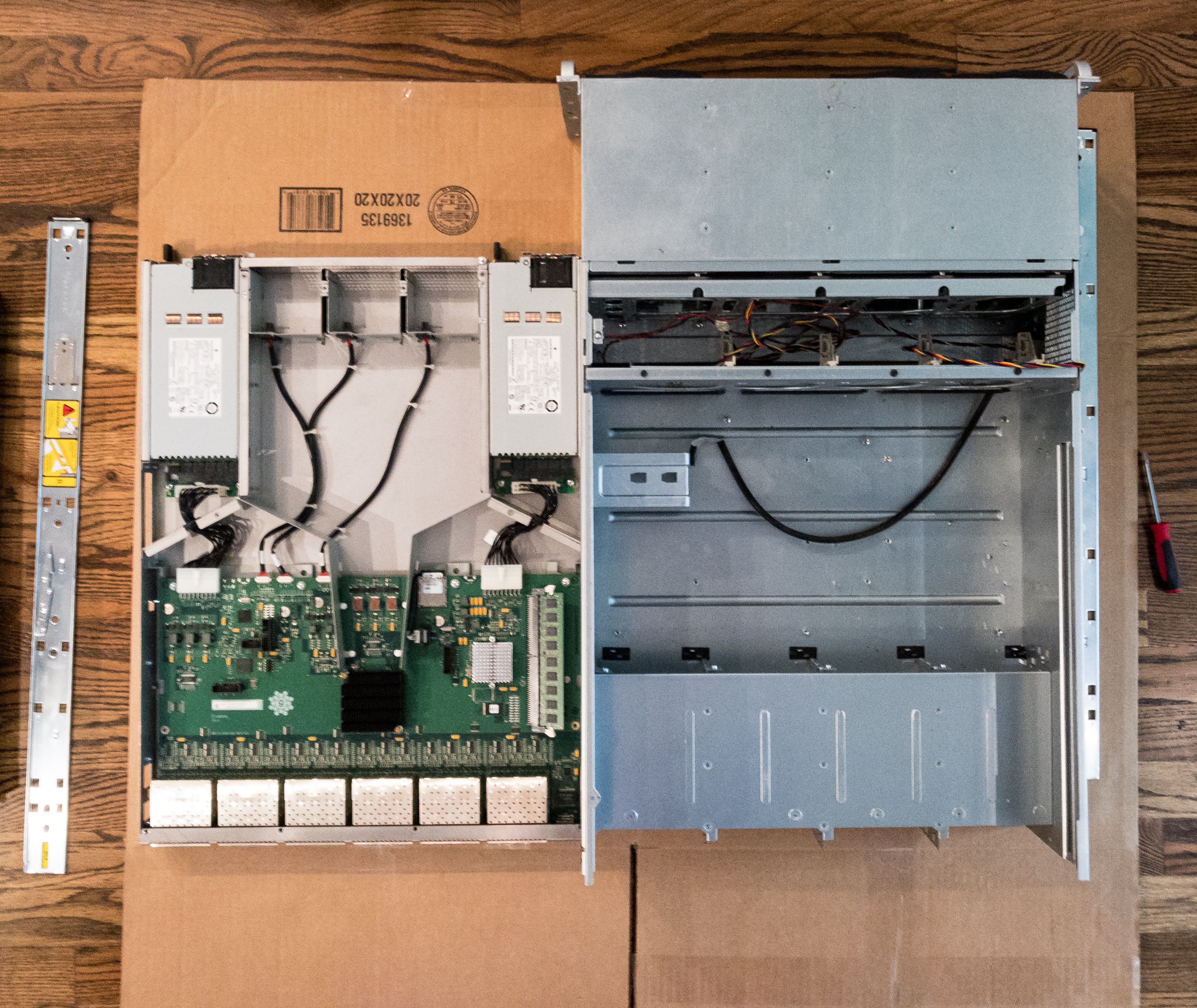 If that backplane is removed, you basically have a second layer which could easily house a second motherboard (or switch main board). It seems to me that a custom slide out tray integrated into the bottom 2U space (basically a duplicate of the top layer) wouldn't be out of the question. Half of the length in the Gnodal switch is air... it could get a lot shorter.