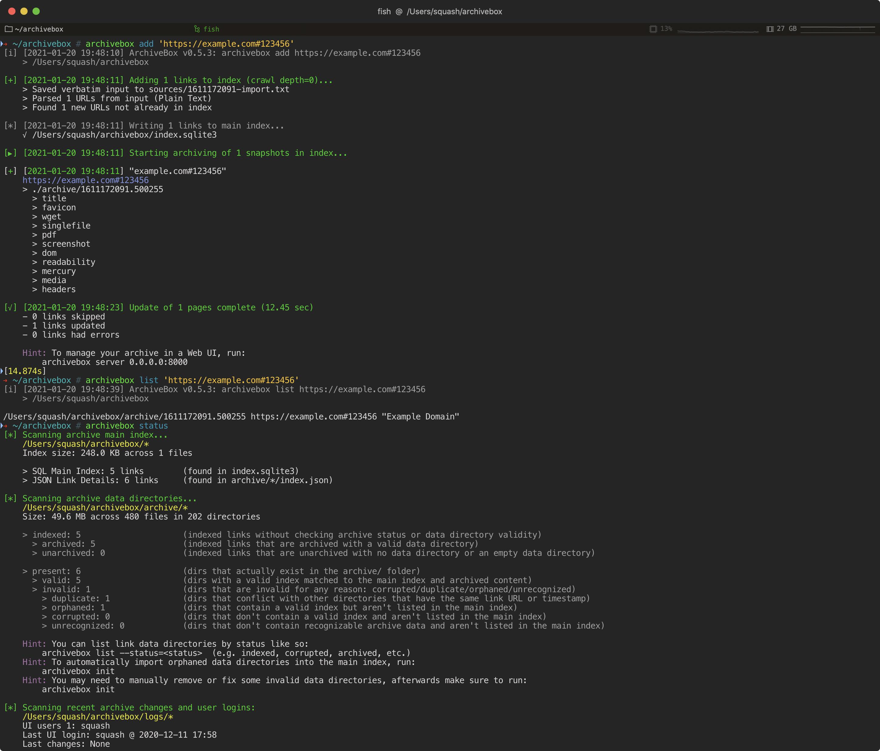 archivebox server 0.0.0.0:8000 # use the interactive web UI archivebox list 'https://example.com' # use the CLI commands (--help for more) ls ./archive/*/index.json # or browse directly via the filesystem