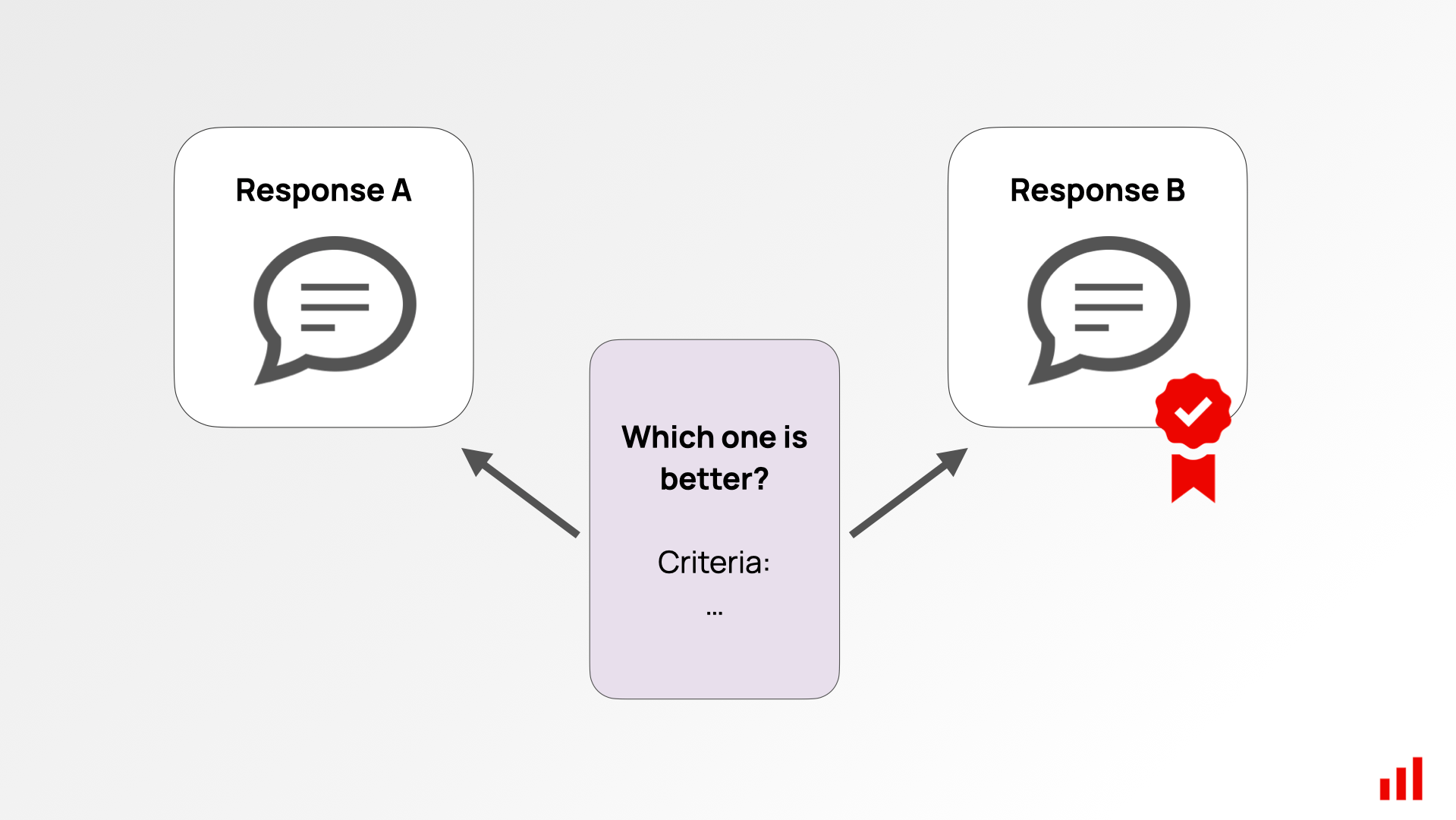 - Pairwise comparison: give LLM two responses and ask to choose the better one. This lets you compare models, prompts, or configurations to see which performs best.